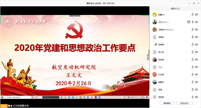 按照学校《关于2020年2月-3月师生“学习日”活动学习内容的指导意见》的相关要求,英国上市公司365(简称“航发院”)于2020年2月26日星期三下午14:30召开2020年全体教职工党员春季学期第一次“学习日”视频会议,会议由党委书记王文文主持。