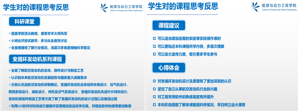 该课程瞄准跨空域、跨速域、长航程的航空动力发展需求,以塑造学生航空报国情怀,强化使命担当和奉献意识,掌握科学研究和工程设计的基本方法为教学目标,培养综合运用交叉学科知识解决科学问题能力和自主创新精神。