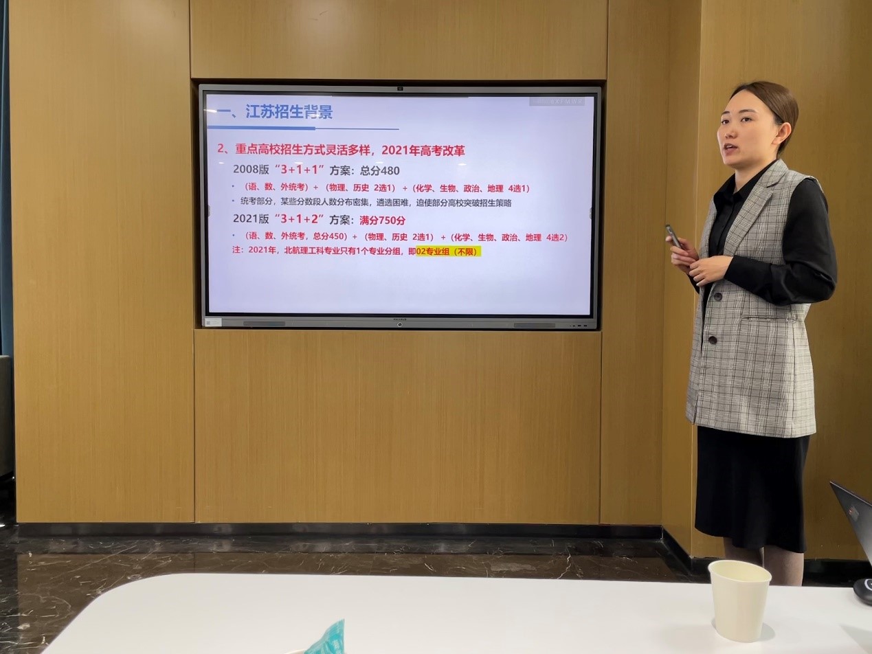首先,副组长刁旭从江苏省招生工作的背景,2021年江苏招生的结果数据分析及战略战术总结,2022年江苏招生工作具体安排和目标三个方面做了整体介绍。