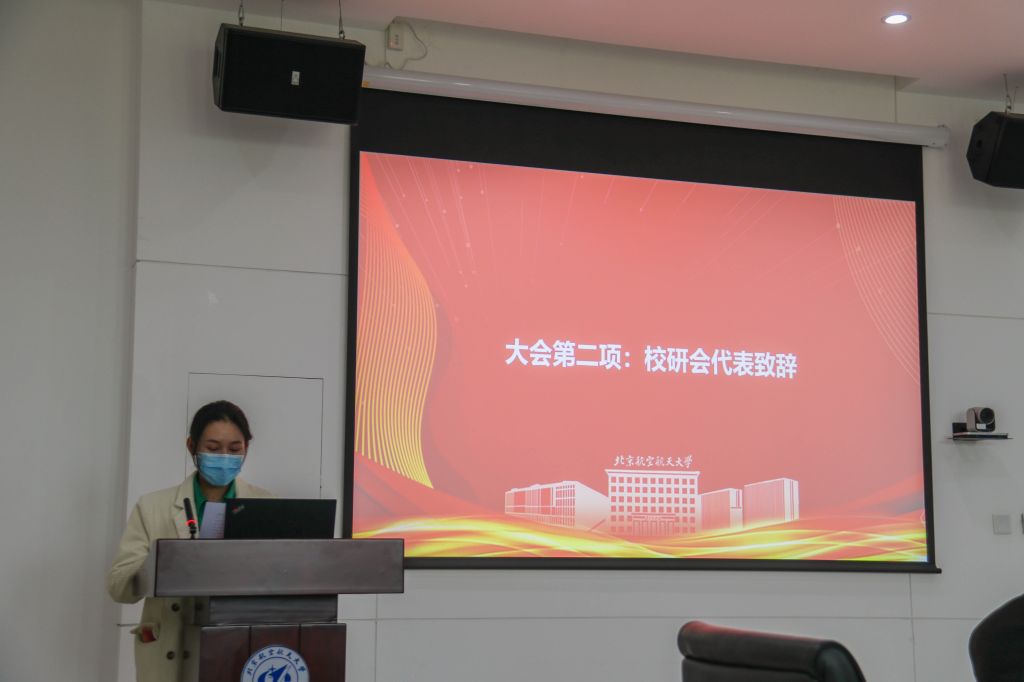 大会在庄严的国歌声中拉开帷幕。首先北航第二十二届研委会副主任黎丽代表校研究生会致辞,对航发院研究生会取得的工作成绩表示充分肯定,并对未来研究生会的发展与改革表达了美好祝愿。