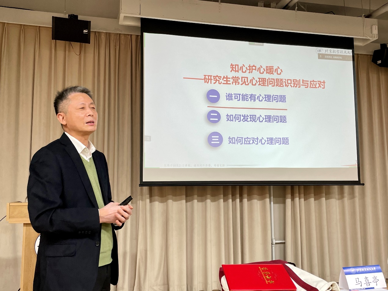 在简短温馨的聘任仪式后,马喜亭做了题为《知心护心暖心——研究生常见心理问题识别与应对》的心理专题报告,从“谁可能有心理问题”“如何发现心理问题”“如何应对心理问题”三个方面介绍了研究生常见心理问题的相关宝贵经验,分享了应对心理问题的“十字技法”等有效方法,并寄语大家成为同学们成长成才的“贵人”,同时欢迎各位思政导师和暖心组长带领同学们前往北航积极心理体验中心参观体验,汲取积极健康的心理动力。