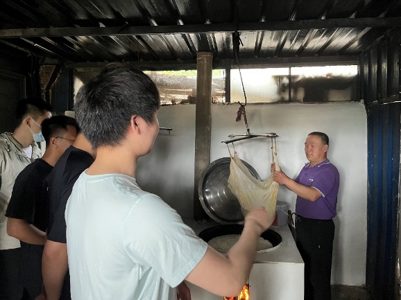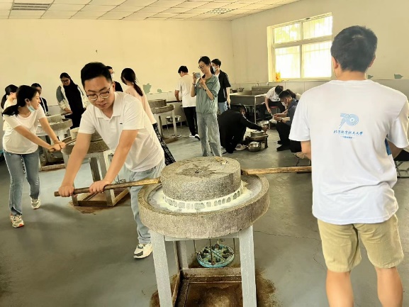 磨豆腐工坊配备了传统石磨和优质豆浆原料,经验丰富的师傅亲自指导各位同学,讲解磨豆腐的技巧和诀窍。同学们动手操作,从泡豆、磨浆、滤渣到煮浆、点卤、成型,在一道道工序中了解了豆腐的前世今生,见证了从豆子到豆腐的华丽蜕变。
