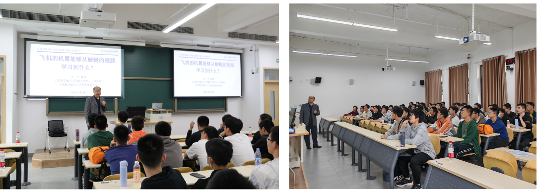 参观结束后,张华教授为苏州中学的师生带来题为《飞机的机翼能够从蜻蜓的翅膀学习到什么?》的专题讲座,开启学生对航空知识的探索之旅。张华教授通过蜻蜓翅膀上的特殊结构——翅痣,引申到机翼的破坏性振动——颤振的现象、概念和机理,最后介绍受蜻蜓翅痣启发成功解决机翼颤振问题的方法。张华教授深入浅出的讲解让原本深奥的自然科学原理变得生动有趣。同学们聚精会神地倾听,报告结束后与张教授热情互动,在学习知识的同时,对北航的向往也愈发强烈。