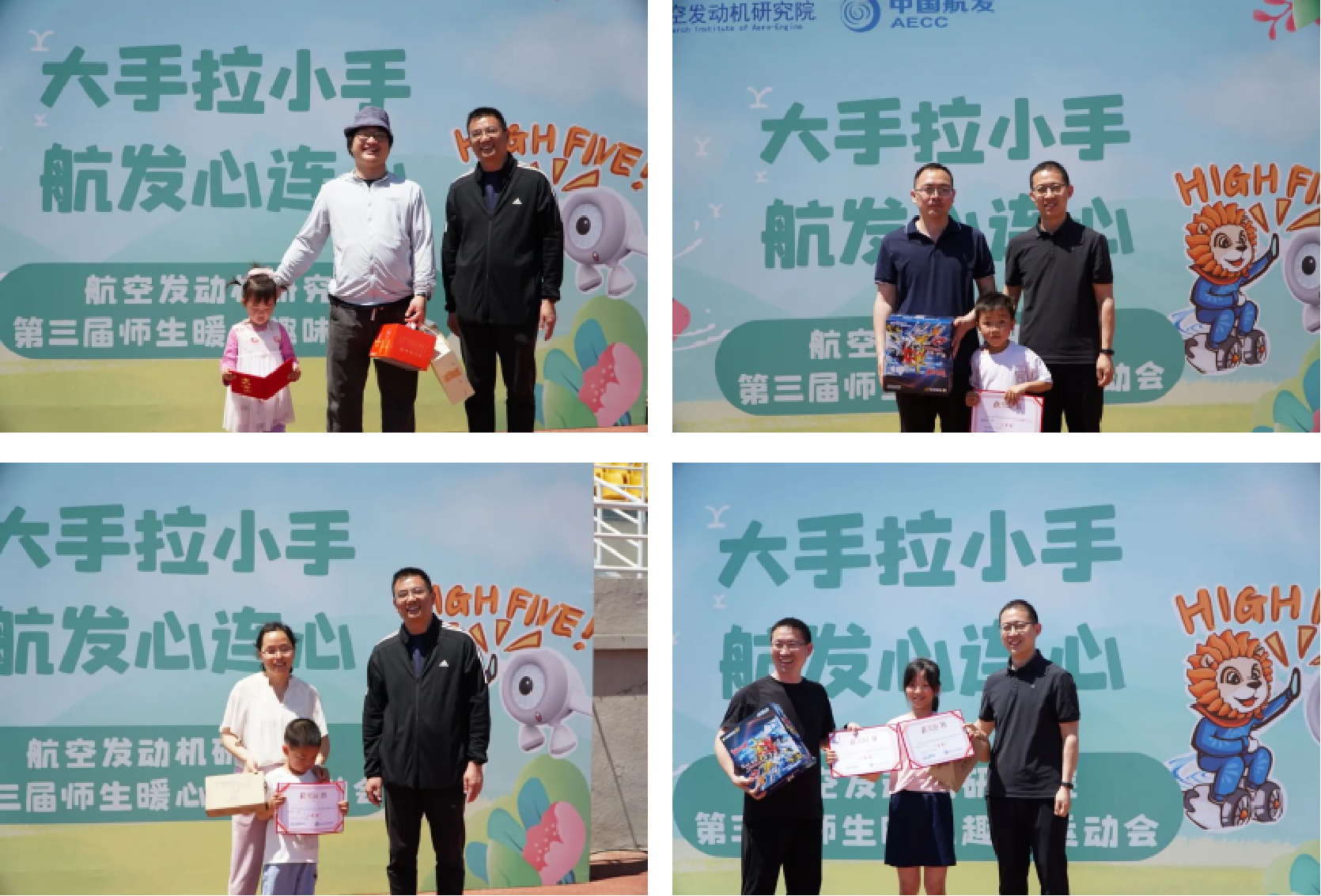 在热烈温馨的氛围中,北航-中国航发师生暖心趣味运动会迎来颁奖时刻。北航航发院党委书记袁星和中国航发党群工作部群团工作处处长田晓光为各年龄段优胜家庭颁奖。