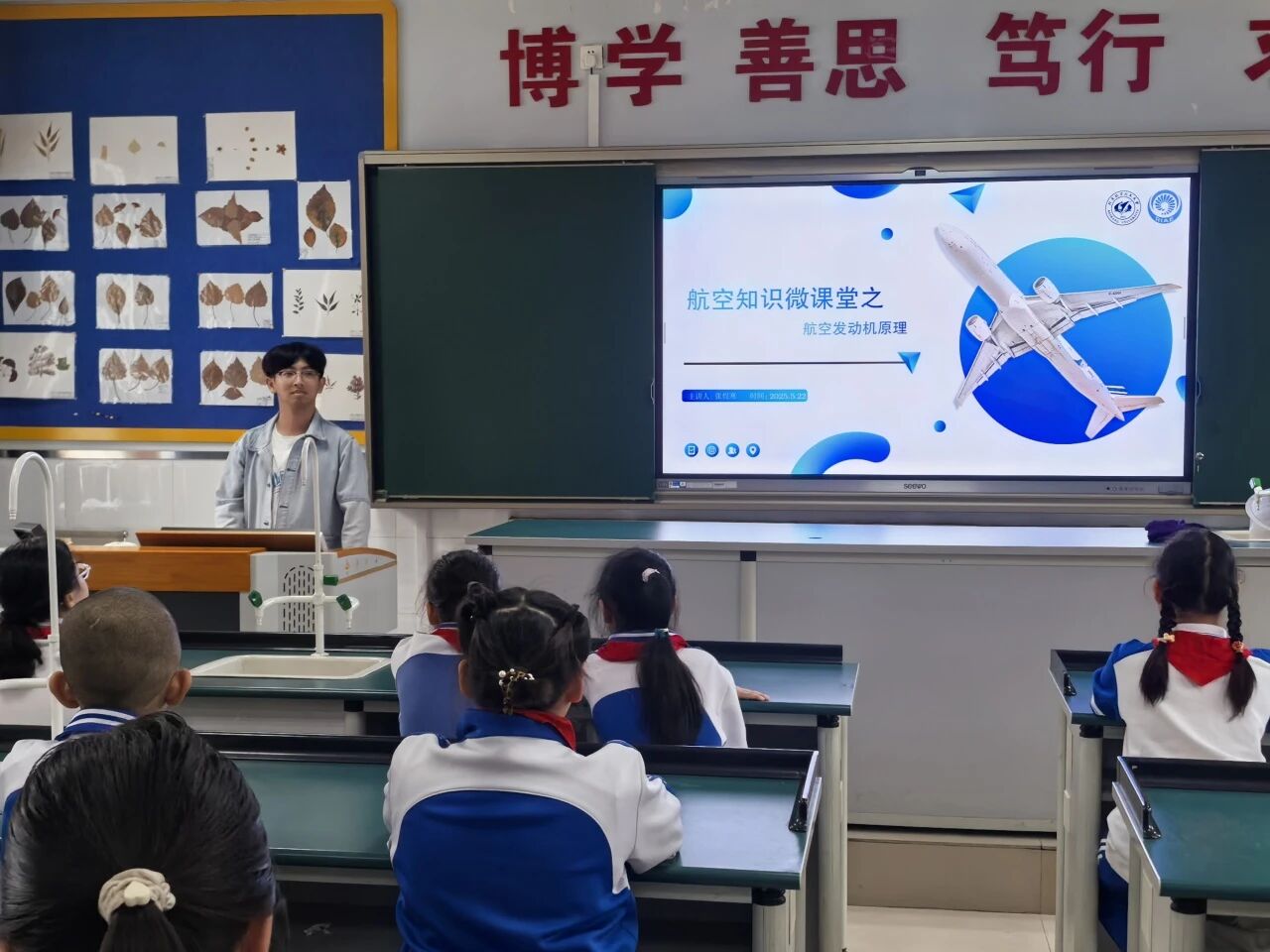 2025年6月12日,齐心党支部入党积极分子孔维地担任主讲人,连同其培养联系人孙卓娅,走进学校为同学们开展航空航天知识微课堂-飞机与发动机介绍。