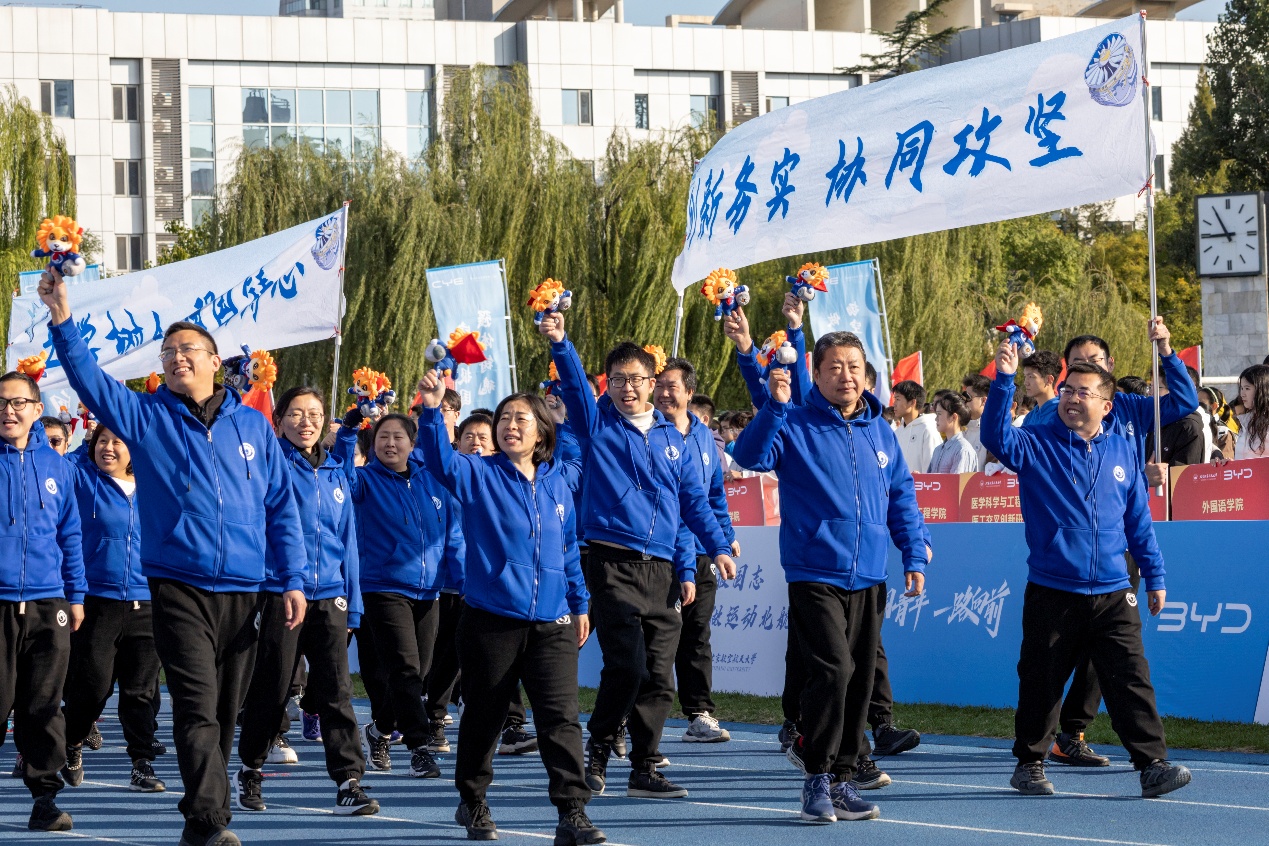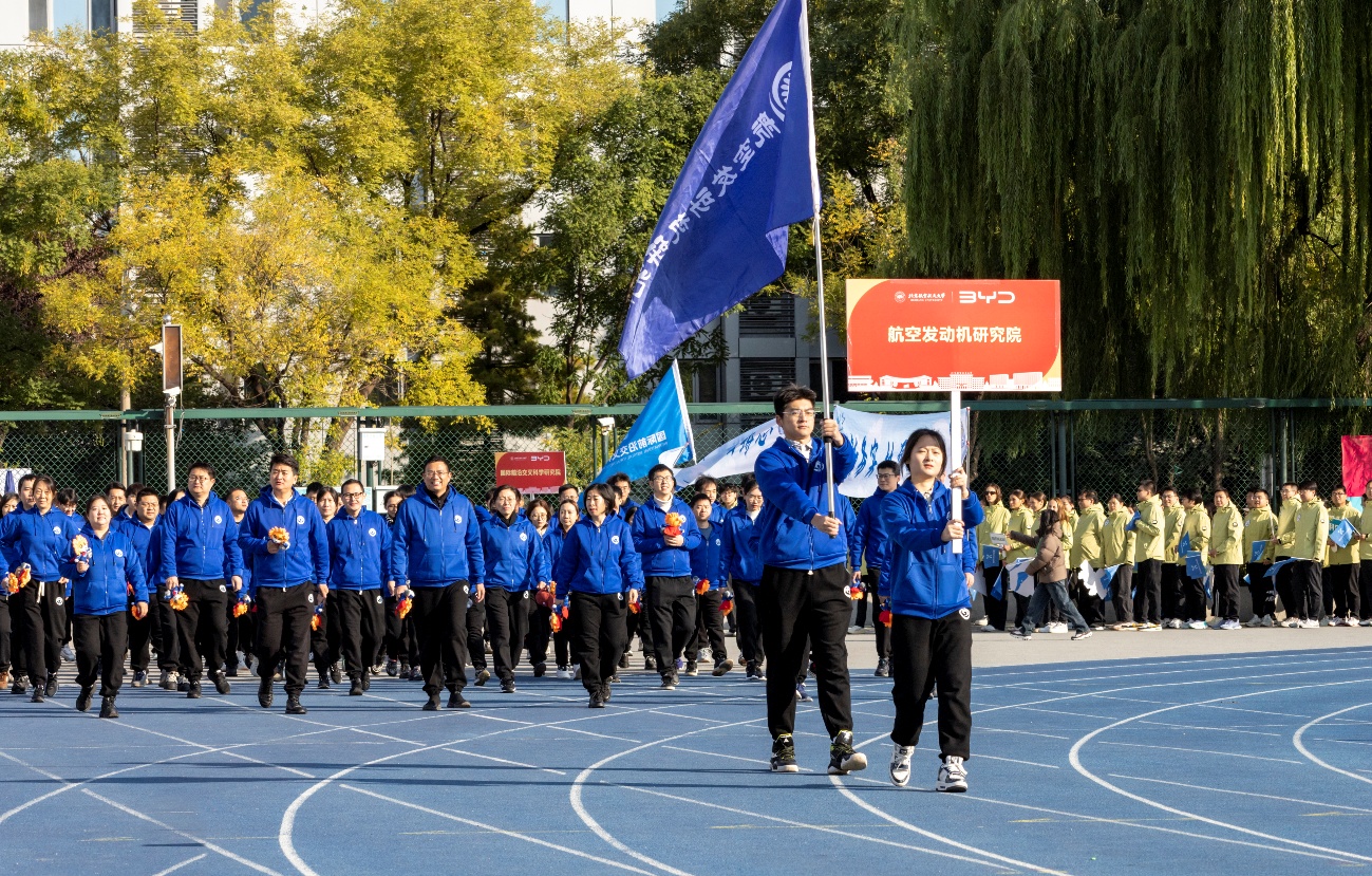 10月18日上午8:30,伴随激昂乐声,运动会开幕式正式开始。在院党委书记袁星与常务副院长胡殿印的带领下,航发院方阵昂首阔步,气势如虹。师生身着蓝色运动服上装,象征着逐梦蓝天的探索精神与空天报国的坚定信念,迈着铿锵有力的步伐,齐声高呼口号:立学树人,强国铸心,创新务实,协同攻坚。青春的光芒闪耀赛场,一声声呐喊,汇聚成航发力量,点燃北航金秋的活力与激情。