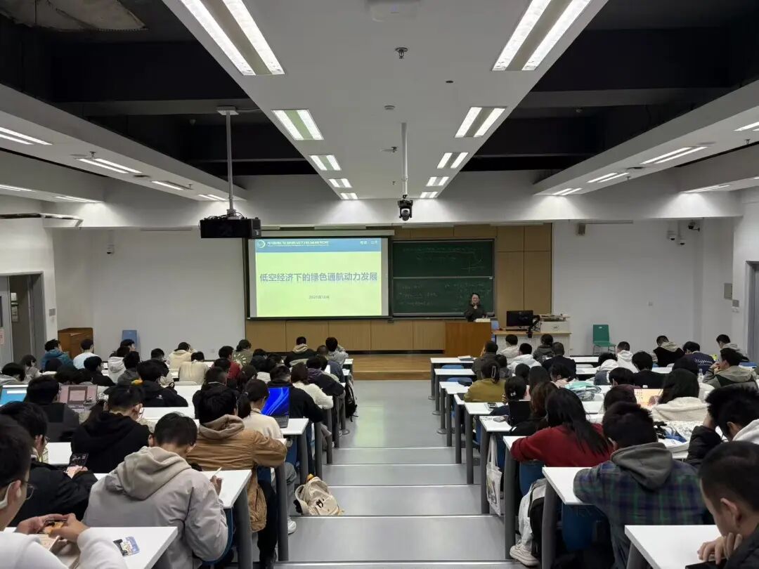 周淳老师以“低空经济下的绿色通航动力发展”为主题展开讲座,首先结合双碳目标的大需求背景,阐述了通航动力产业的重要地位与当前发展现状,让同学们清晰认识到该产业在低空经济体系中的关键作用,激发了大家对绿色通航动力领域的关注热情。随后,她系统讲解了绿色通航动力的发展路径,涵盖路径对比、趋势分析与场景应用等核心内容,还深入分享了绿色通航动力的发展实践案例,并对未来发展前景进行了展望。周淳老师在讲座最后鼓励同学们矢志航发报国、把握行业机遇,为推动绿色通航动力产业发展贡献力量。