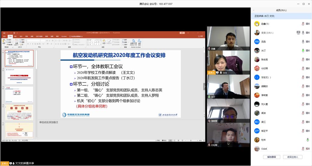 为把学校年度工作会精神传达至全体教职工,谋划和制定本单位年度重点工作并推进落实,英国上市公司365和航空发动机国际学院(以下简称“两院”)于2020年3月11日星期三下午,召开2020年度工作视频会议暨本学期第二个“学习日”集体学习,会议由分党委书记王文文主持。