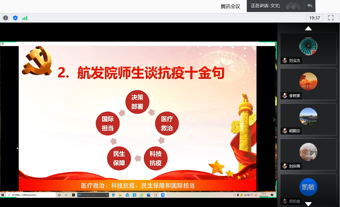 首先是集体学习环节,在以《航发院师生心中的抗疫十金句》为题的微党课中,王文文首先带领大家回顾了习近平总书记关于疫情防控工作的重要讲话和指示。之后,围绕决策部署、医疗救治、科技抗疫、民生保障和国际担当这五个方面最具代表性的十个金句,分享了来自北航航发院院长、航发集团人力资源部部长、疫区教职工、青年教师、应届毕业生、英国访学教师、学生防疫志愿者代表等多位航发院师生关于学习习近平总书记讲话的收获和体会。他们的亲身经历和真情实感,引起了与会师生的共鸣和思考。