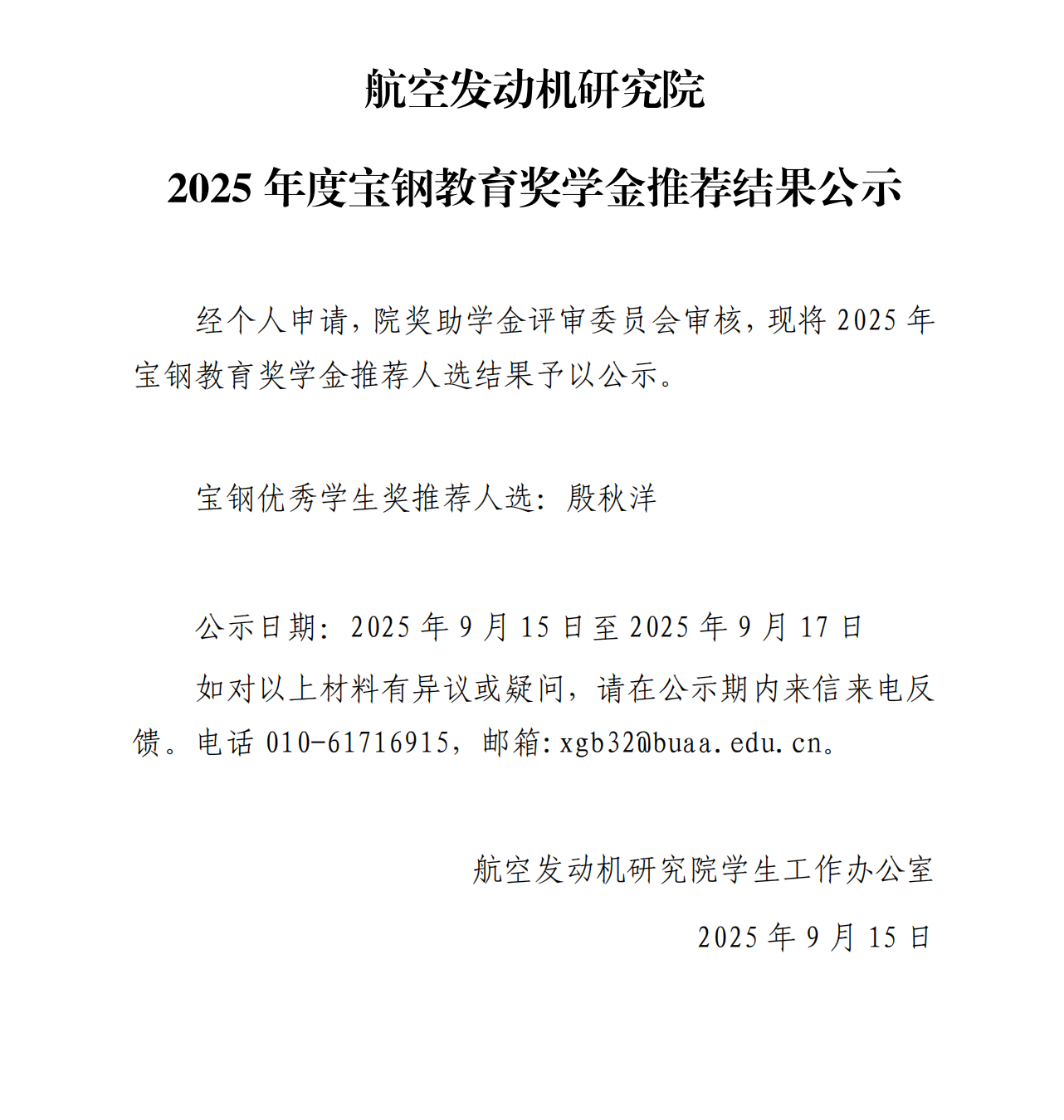 航发院2025年度宝钢教育奖学金推荐结果公示