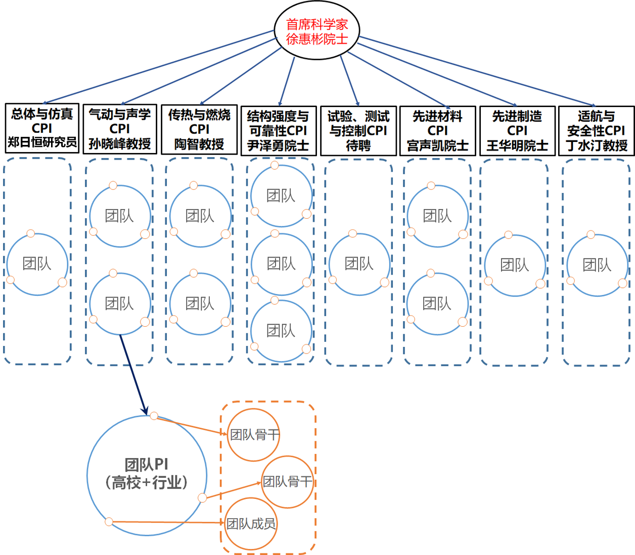 “两院”设置首席科学家岗位统筹8个学术领域发展,由徐惠彬院士担任。每个学术领域设置领域首席(CPI)1人,每个学术领域根据领域特点和发展需要设置不超过3个基础研究方向团队,每个基础研究方向团队设置团队负责人(PI)2人,分别来自高校和行业。每个基础研究方向团队可根据团队任务需要设置团队骨干和团队成员岗位若干。
